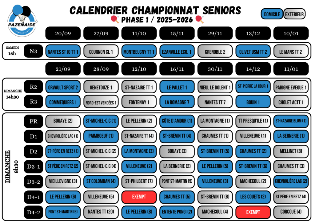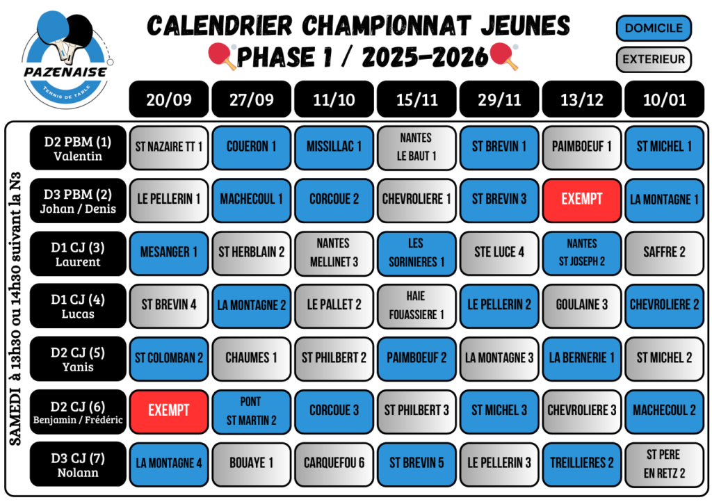 Planning des matchs de la Pazenaise Tennis de Table