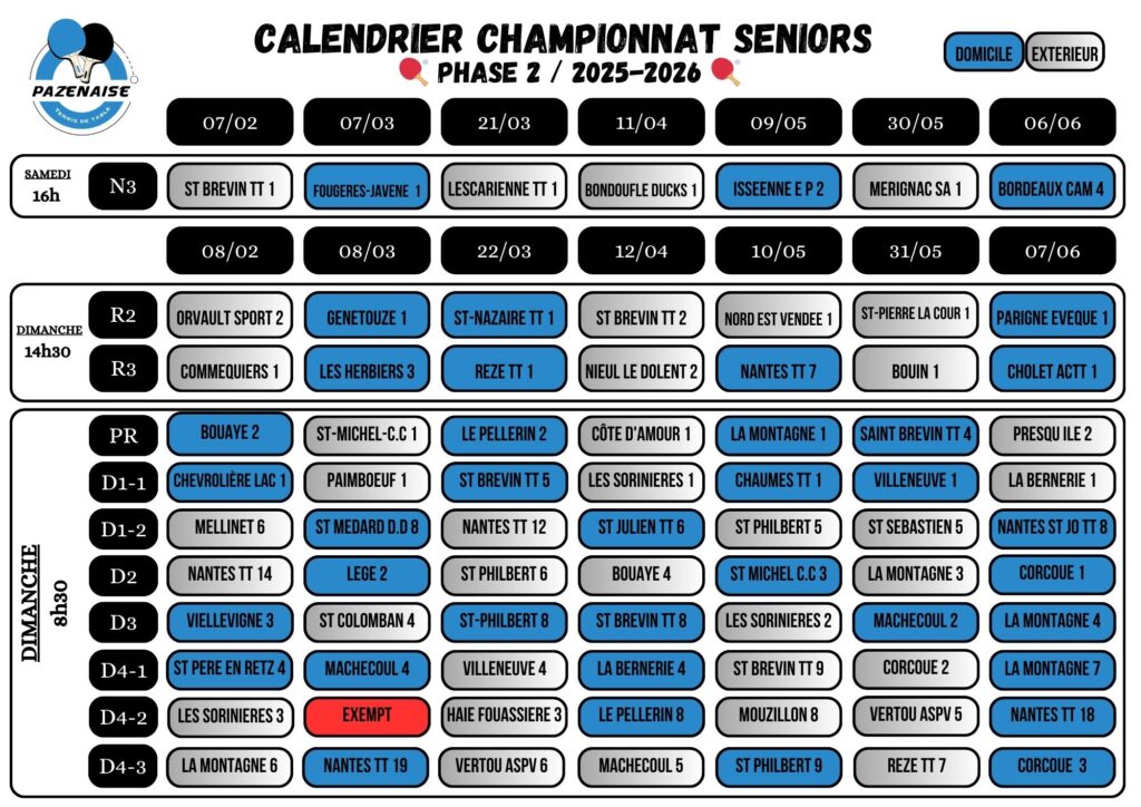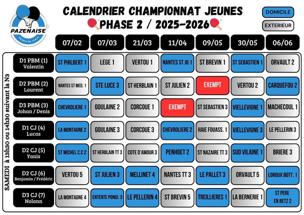 Planning des matchs de la Pazenaise Tennis de Table