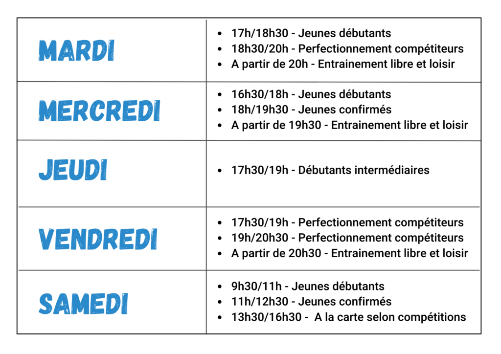 Voici le planning des entraînements et horaires du 02/09/2025 au 04/07/2026, toutes les semaines hors vacances scolaires et pont de l’ascension.